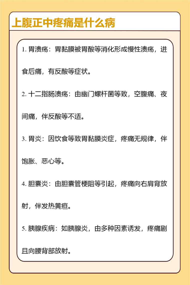 上腹正中疼痛可能由胃溃疡、十二指肠溃疡、胃炎、胆囊炎、胰腺疾病等引起。