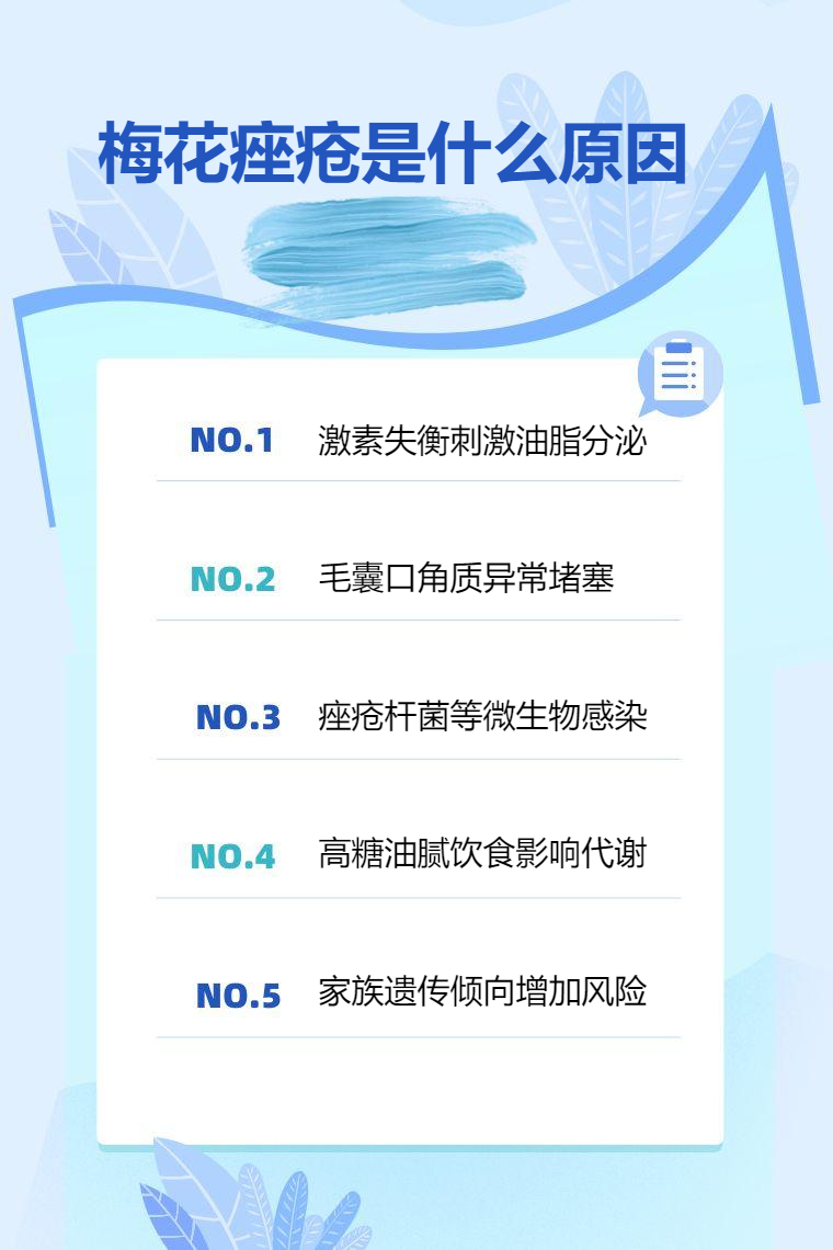 1. 内分泌失调:内分泌系统失衡时,雄激素水平相对升高,会刺激皮脂腺分泌过多油脂,导致毛囊口堵塞,为痤疮丙酸杆菌等微生物的滋生创造条件,进而引发梅花痤疮。青春期人群由于激素水平变化剧烈,是内分泌失调引发痤疮的高发群体。