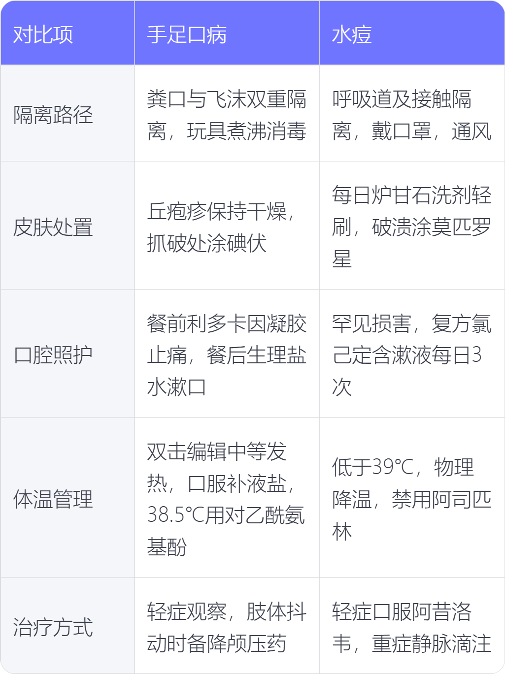 手足口病与水痘的护理在隔离路径、皮肤处置、口腔照护、体温管理、治疗方式上各具特点。