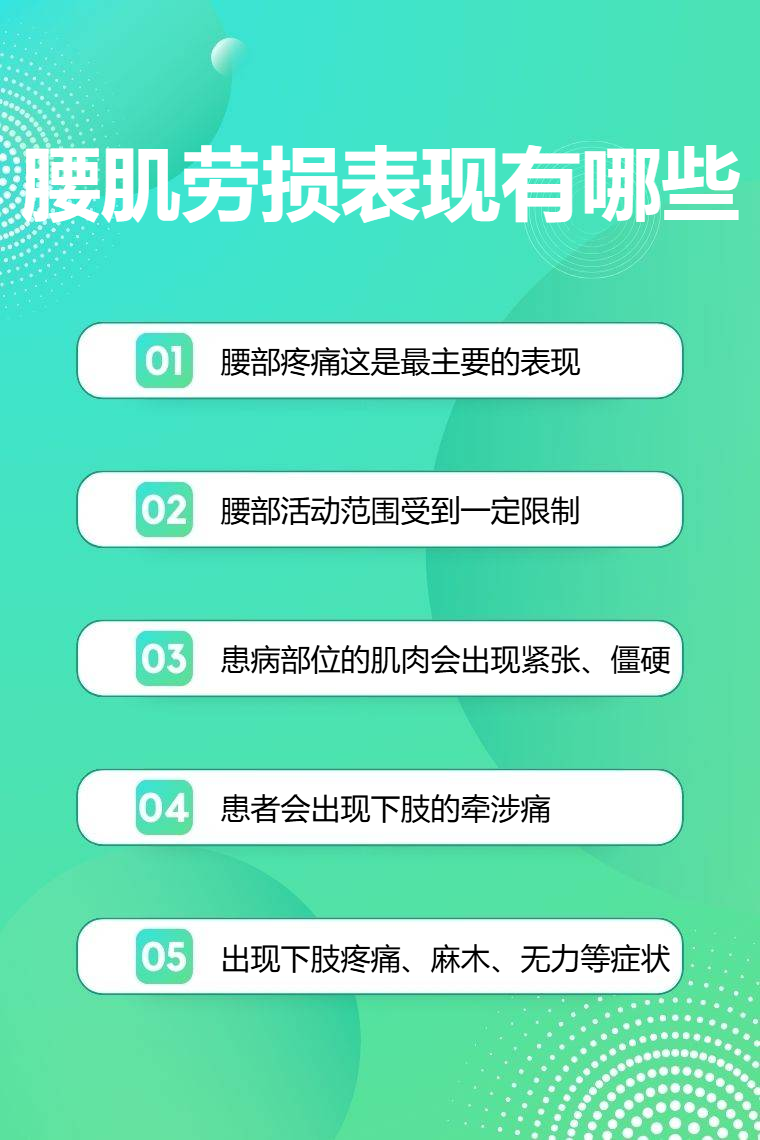 4. 下肢牵涉痛:部分患者会出现下肢的牵涉痛,疼痛一般不超过膝关节,多为酸痛、麻痛等,因为腰部肌肉劳损刺激到周围神经引起的。