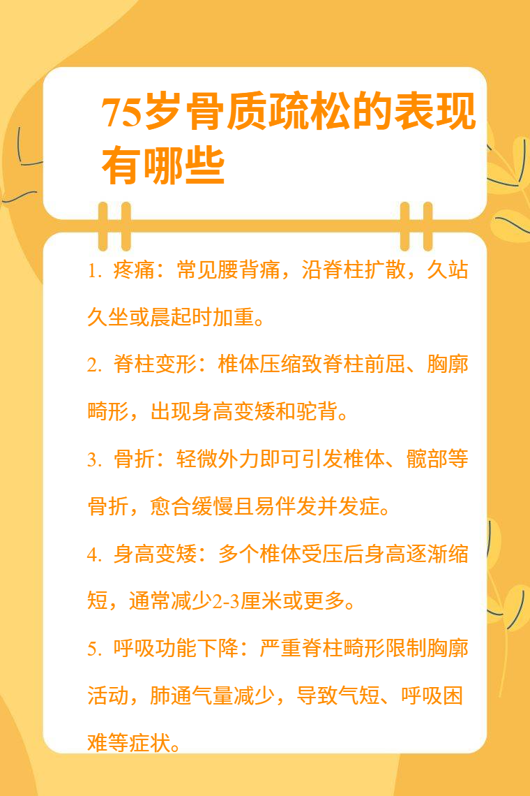 75岁骨质疏松的表现有疼痛、脊柱变形、骨折、身高变矮、呼吸功能下降等。
