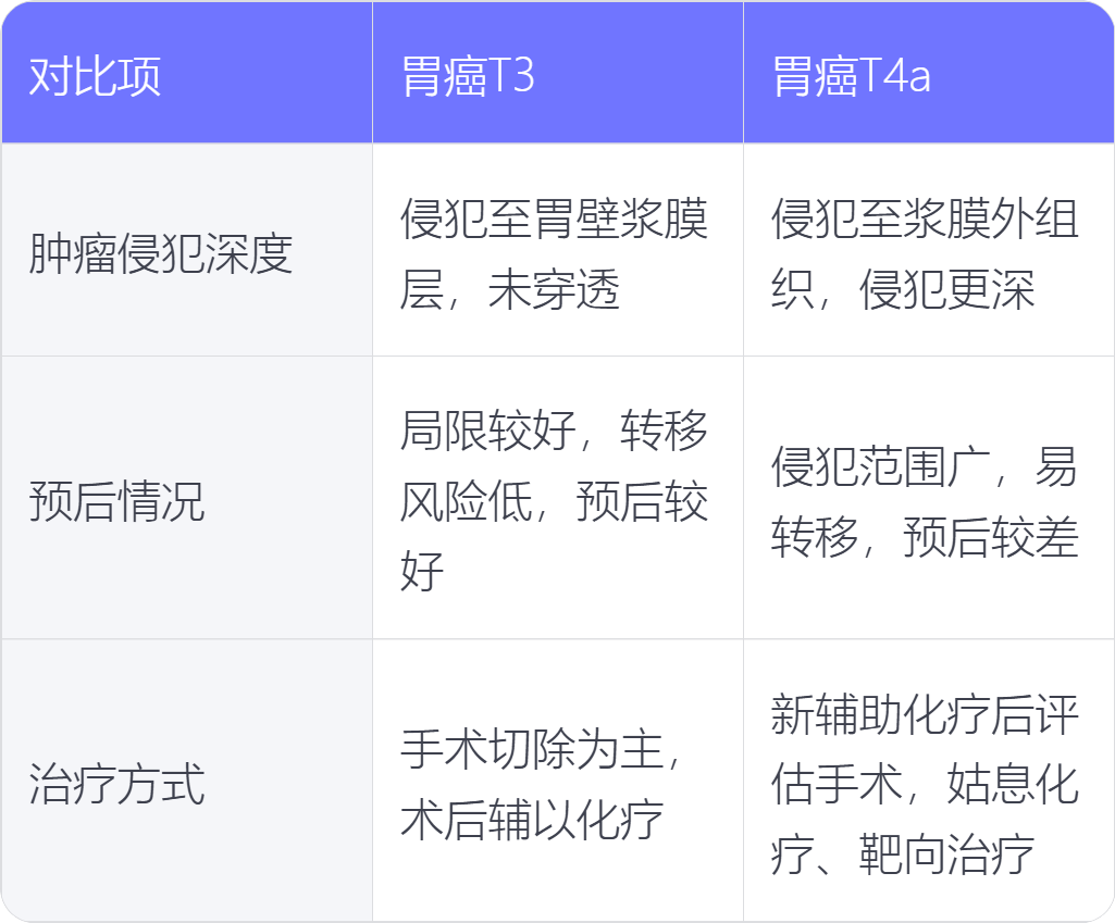 胃癌t3和t4a在肿瘤侵犯深度、预后情况、治疗方式上存在不同。