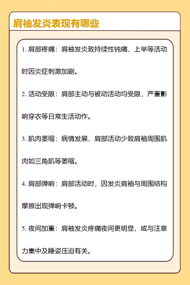 1. 肩部疼痛:肩袖发炎时,肩部会出现明显疼痛,多为持续性钝痛,在肩部活动尤其是上举、外展等动作时,疼痛会加剧,这是由于炎症刺激肩袖组织及周围神经导致。