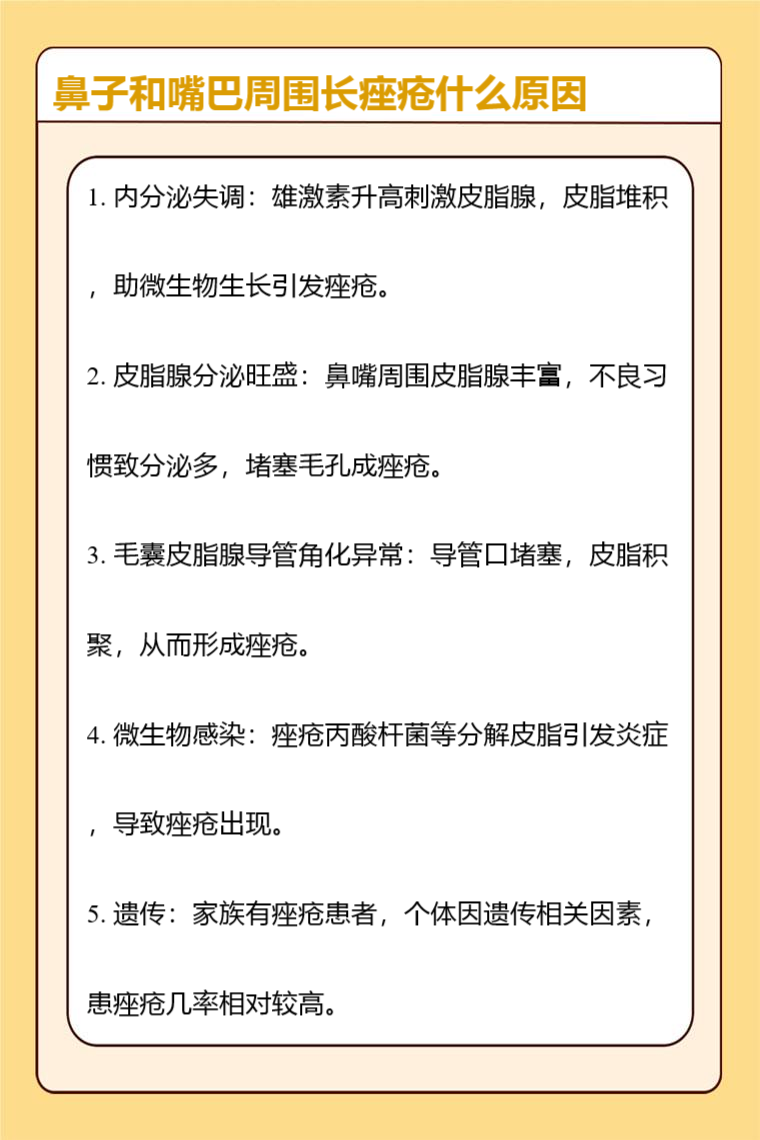 鼻子和嘴巴周围长痤疮的原因有内分泌失调、皮脂腺分泌旺盛、毛囊皮脂腺导管角化异常、微生物感染、遗传等。