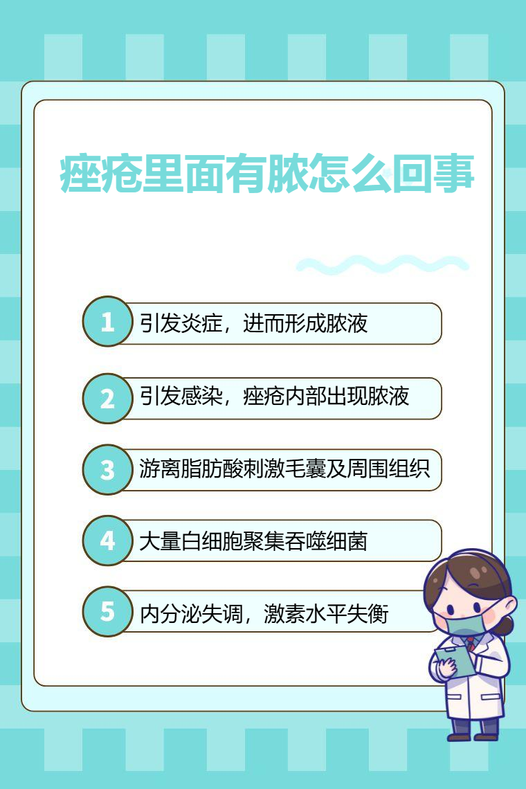 痤疮里面有脓通常是皮脂腺分泌旺盛、毛囊口角化异常、痤疮丙酸杆菌繁殖、炎症反应加剧、内分泌失调等情况导致。