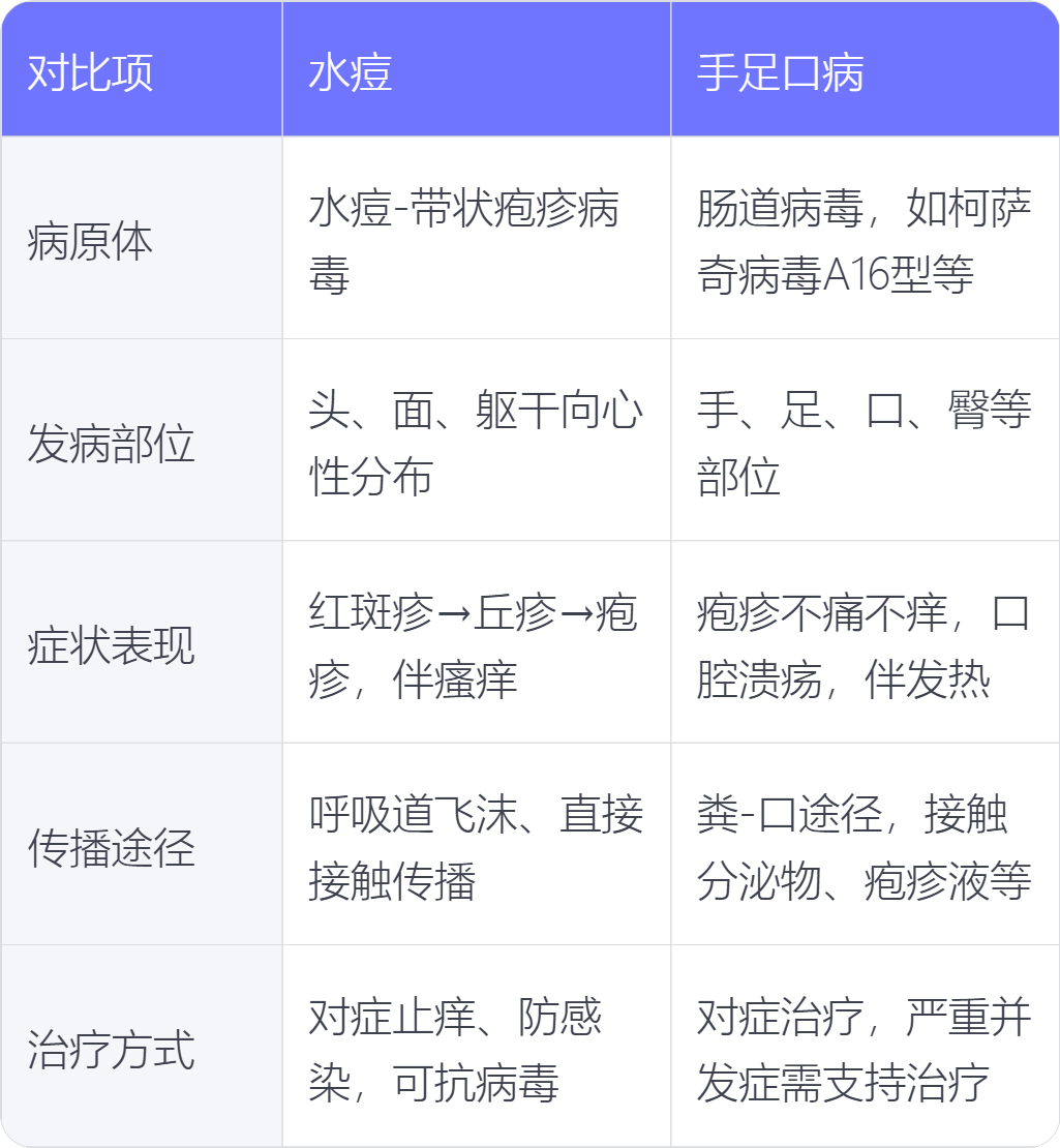 5. 治疗方式:水痘主要是对症治疗,如止痒、防止感染等,可使用抗病毒药物;手足口病一般也是对症治疗,若出现神经系统、呼吸系统等严重并发症,需采取相应的支持治疗措施。