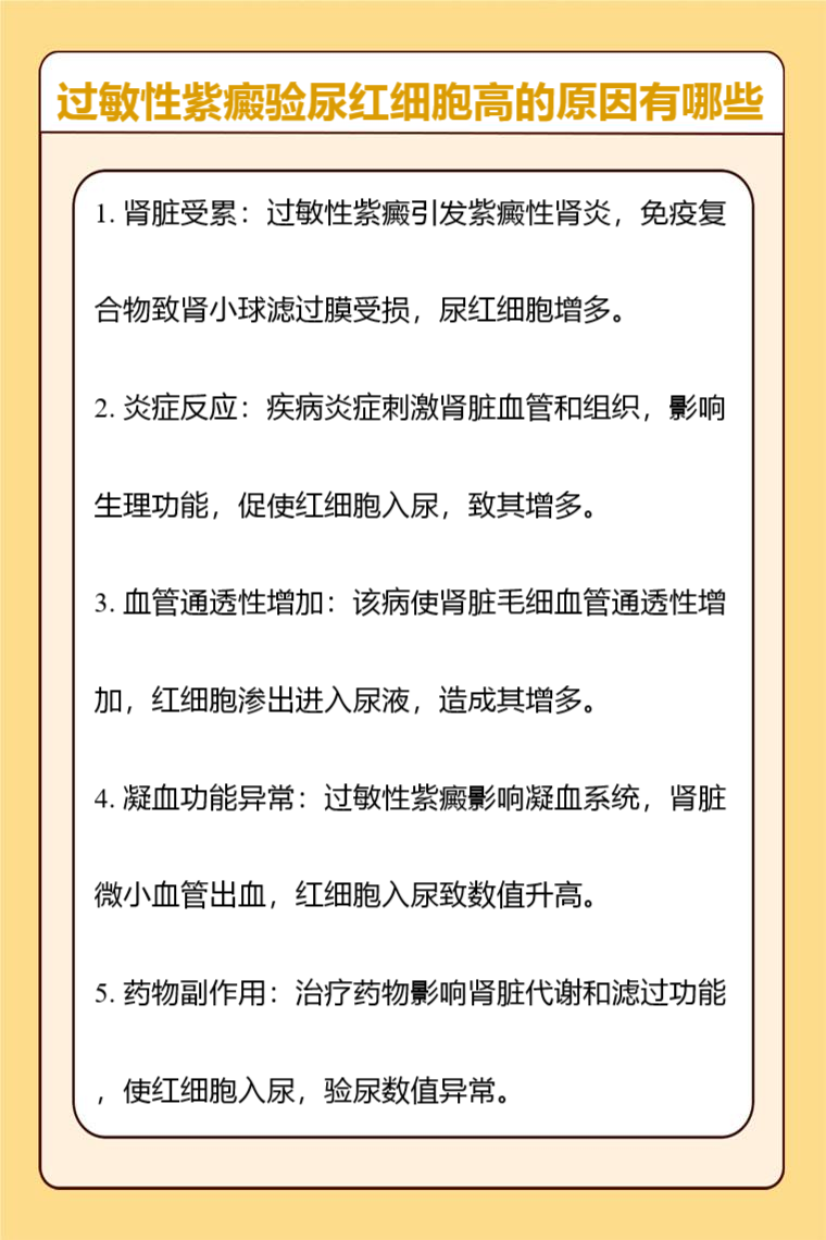 过敏性紫癜验尿红细胞高的原因有肾脏受累、炎症反应、血管通透性增加、凝血功能异常、药物副作用等。