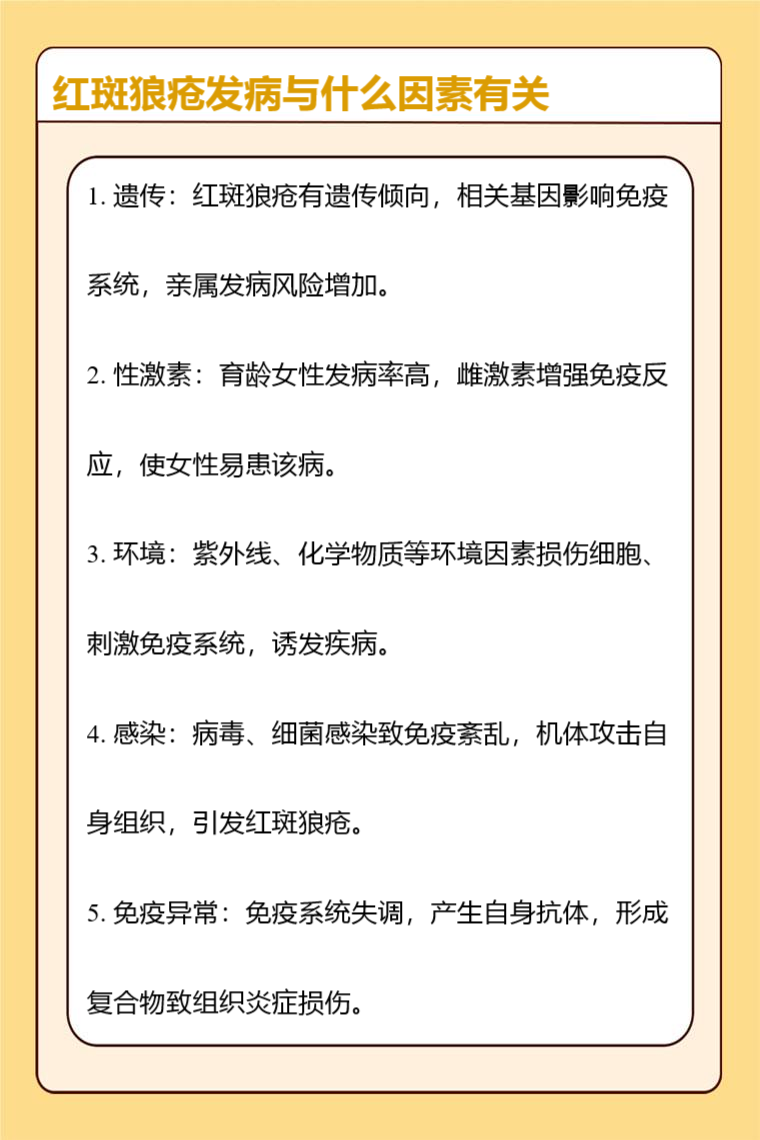 红斑狼疮发病与遗传、性激素、环境、感染、免疫异常等因素有关。