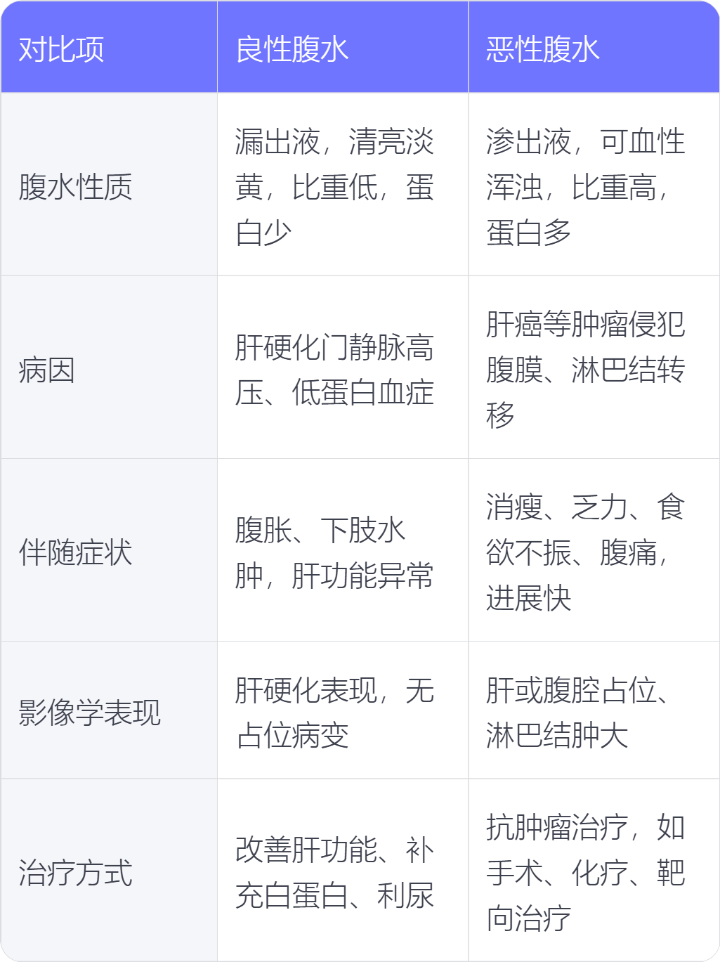 肝硬化良性与恶性腹水在腹水性质、病因、伴随症状、影像学表现、治疗方式上存在不同。