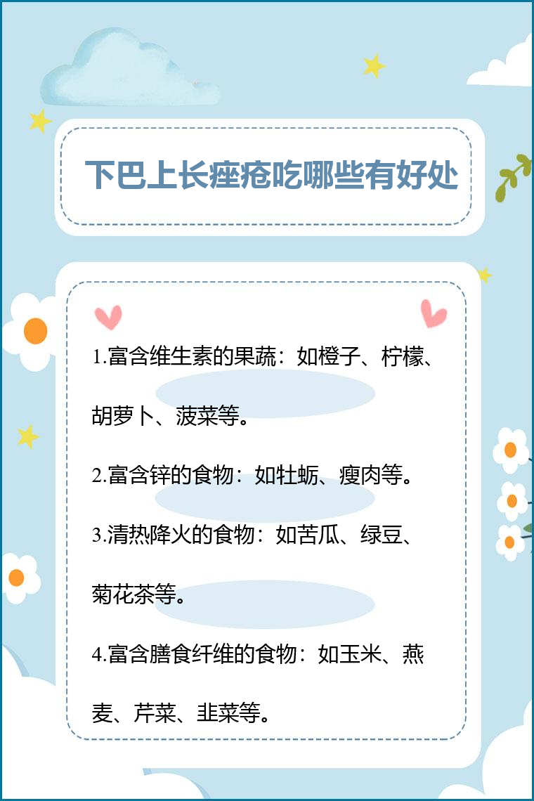 下巴长痤疮可通过食用富含维生素的果蔬、富含锌的食物、清热降火的食物、富含膳食纤维的食物等进行调理。