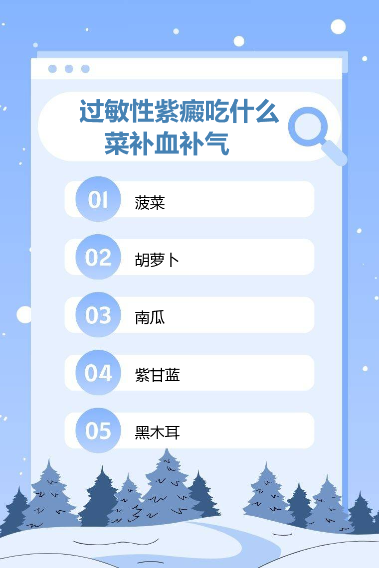 菠菜、胡萝卜、南瓜、紫甘蓝、黑木耳等是适合过敏性紫癜患者补血补气的蔬菜。
