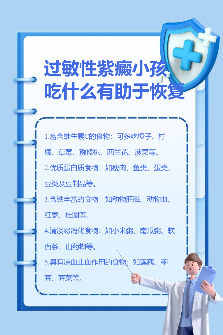 过敏性紫癜小孩吃富含维生素C的食物、优质蛋白质食物、含铁丰富的食物、清淡易消化食物、具有凉血止血作用的食物等有助于恢复。