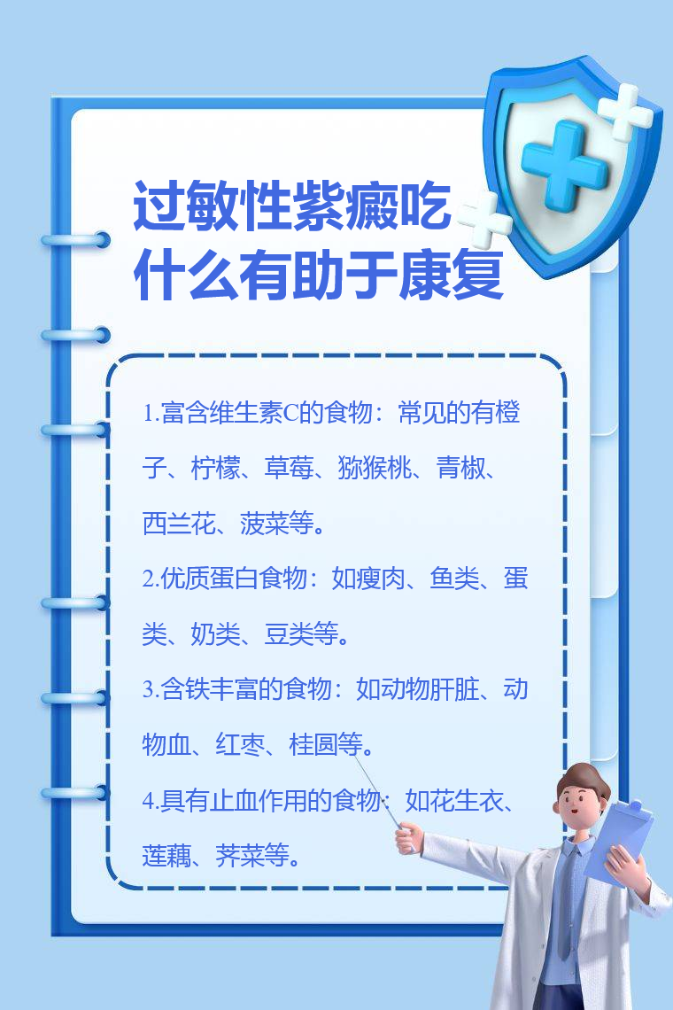 过敏性紫癜患者食用富含维生素C的食物、优质蛋白食物、含铁丰富的食物、具有止血作用的食物等有助于康复。