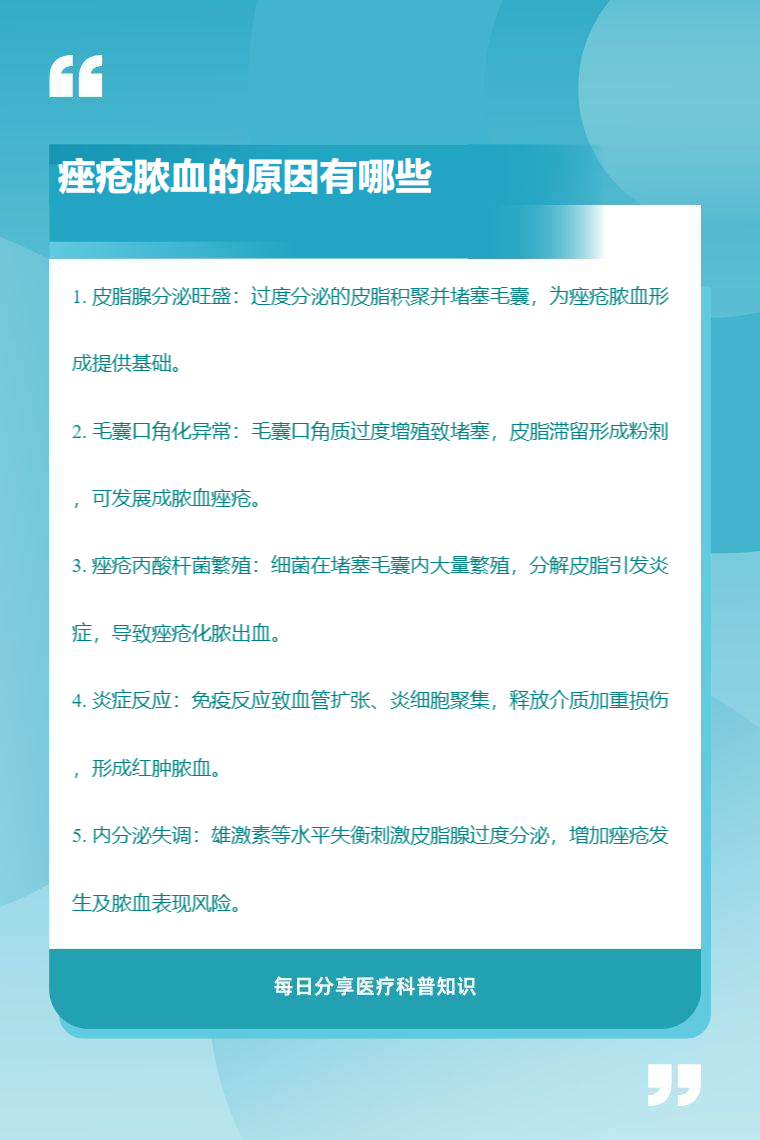 痤疮脓血的原因有皮脂腺分泌旺盛、毛囊口角化异常、痤疮丙酸杆菌繁殖、炎症反应、内分泌失调等。