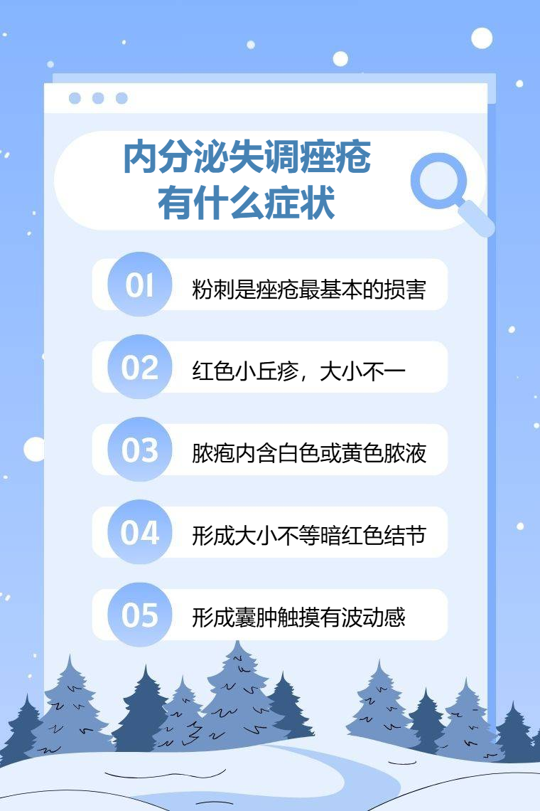 内分泌失调痤疮的症状包括粉刺、丘疹、脓疱、结节、囊肿等。