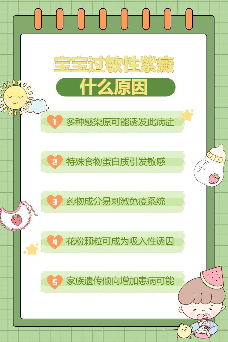 宝宝过敏性紫癜常见原因有感染、食物过敏、药物过敏、花粉过敏、遗传因素等。