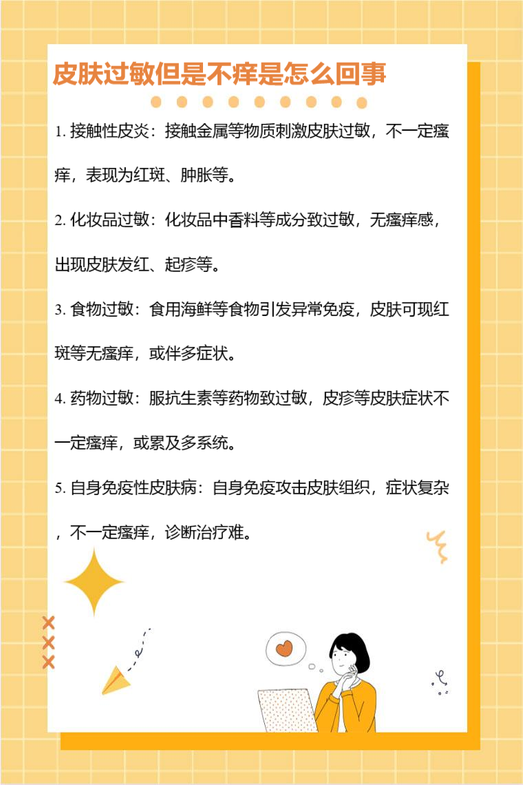 皮肤过敏但不痒可能由接触性皮炎、化妆品过敏、食物过敏、药物过敏、自身免疫性皮肤病等引起。