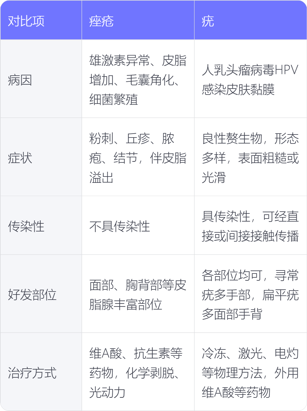 痤疮与疣在病因、症状、传染性、好发部位、治疗方式上存在不同。