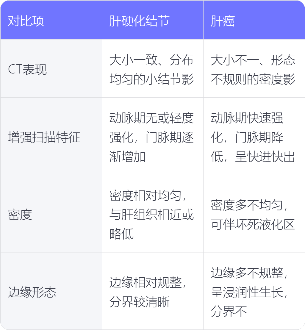 肝硬化结节与肝癌在CT表现、增强扫描特征、密度、边缘形态上存在不同。