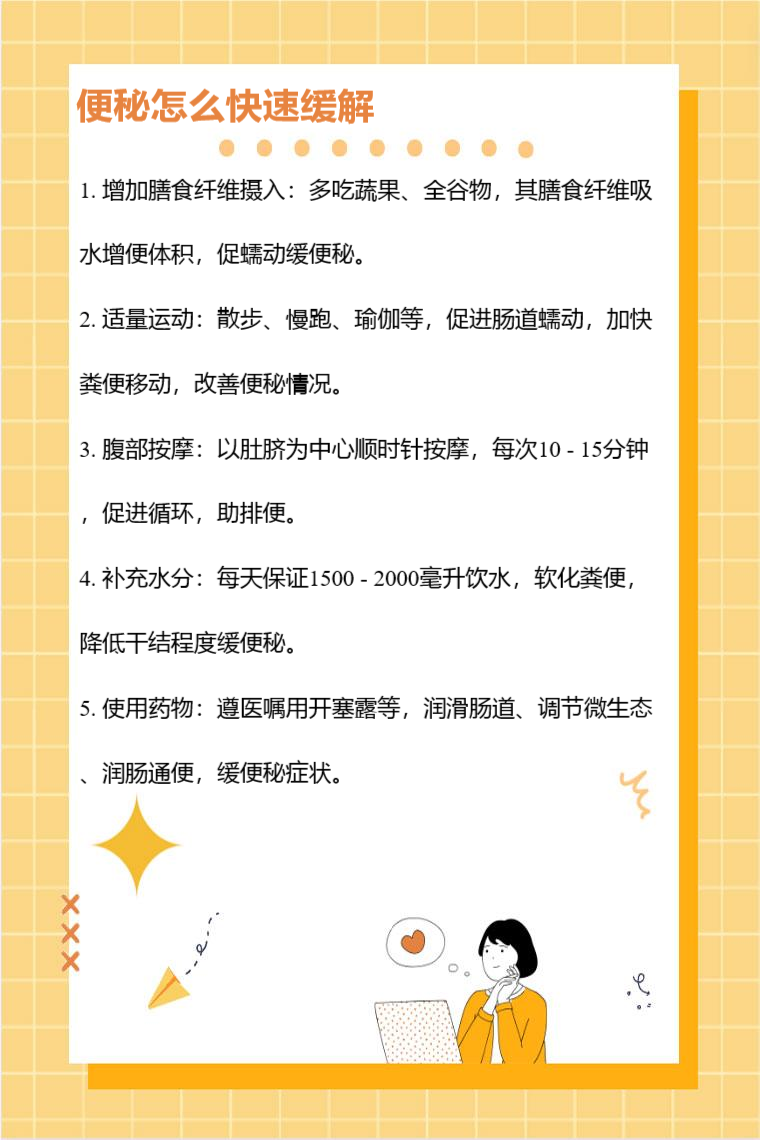 快速缓解便秘可通过增加膳食纤维摄入、适量运动、腹部按摩、补充水分、使用药物等。