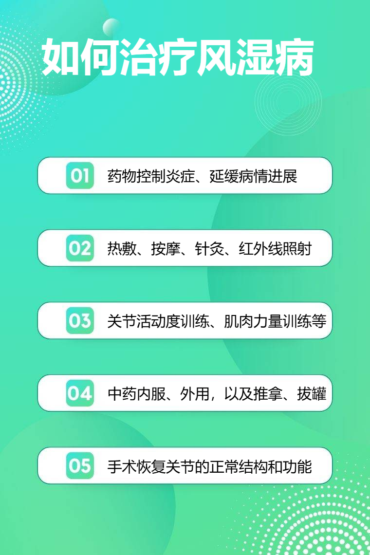 治疗风湿病常见的方法有药物治疗、物理治疗、康复锻炼、中医治疗、手术治疗等。