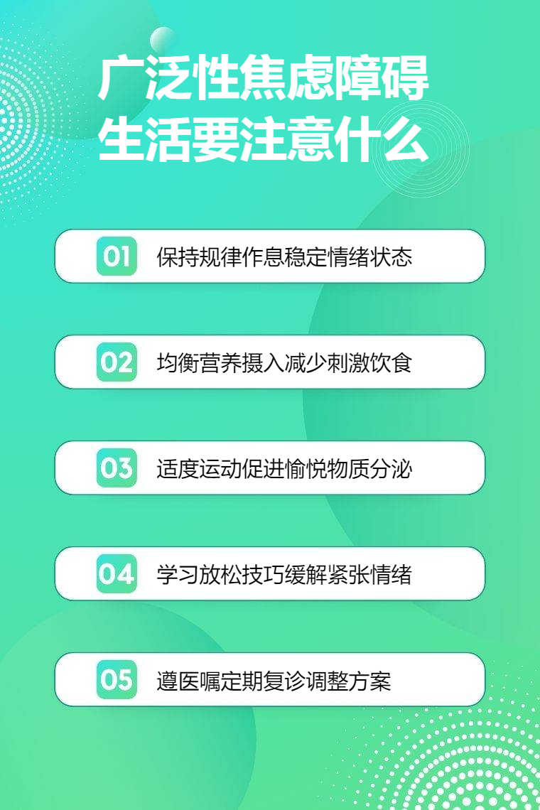 广泛性焦虑障碍患者生活中要注意规律作息、调节饮食、适度运动、心理调节、定期就医等。