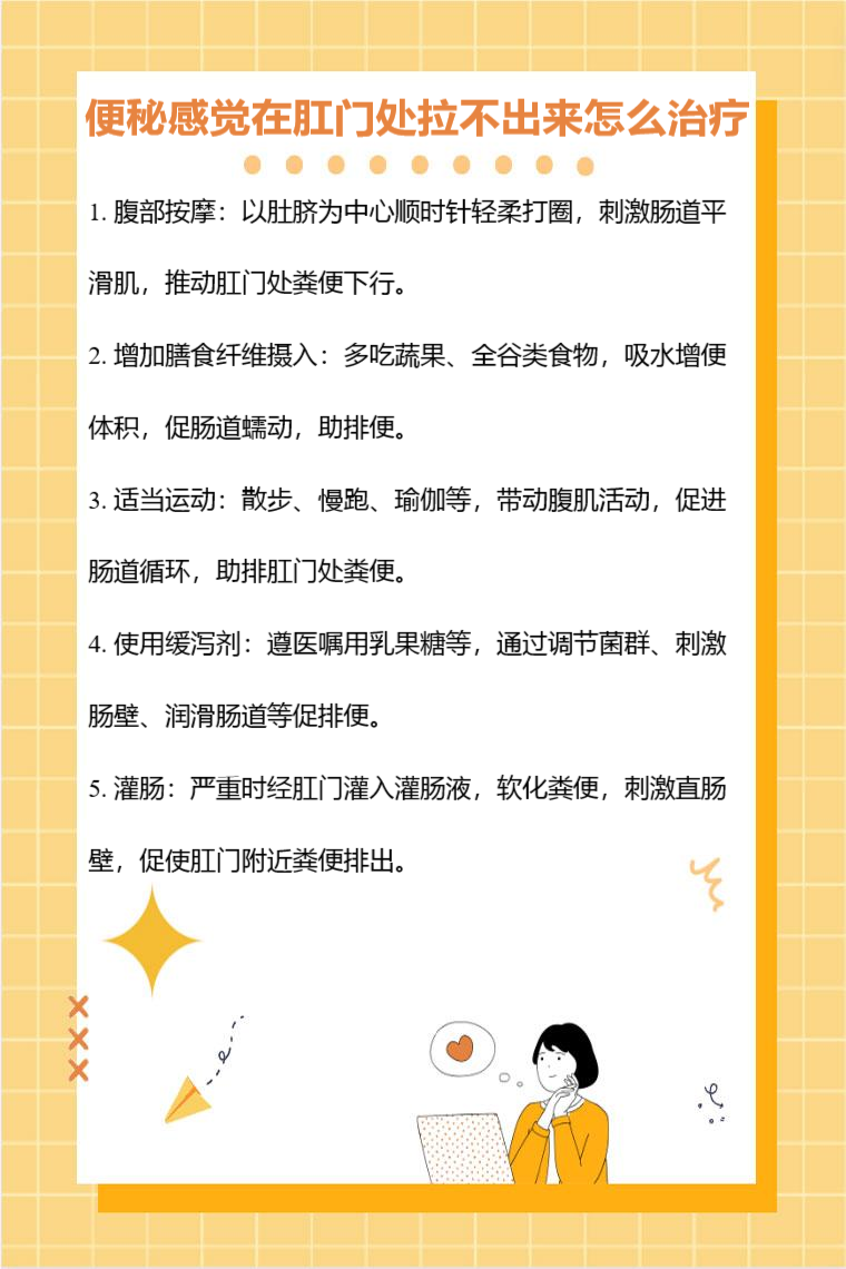 便秘感觉在肛门处拉不出来可通过腹部按摩、增加膳食纤维摄入、适当运动、使用缓泻剂、灌肠等方法治疗。