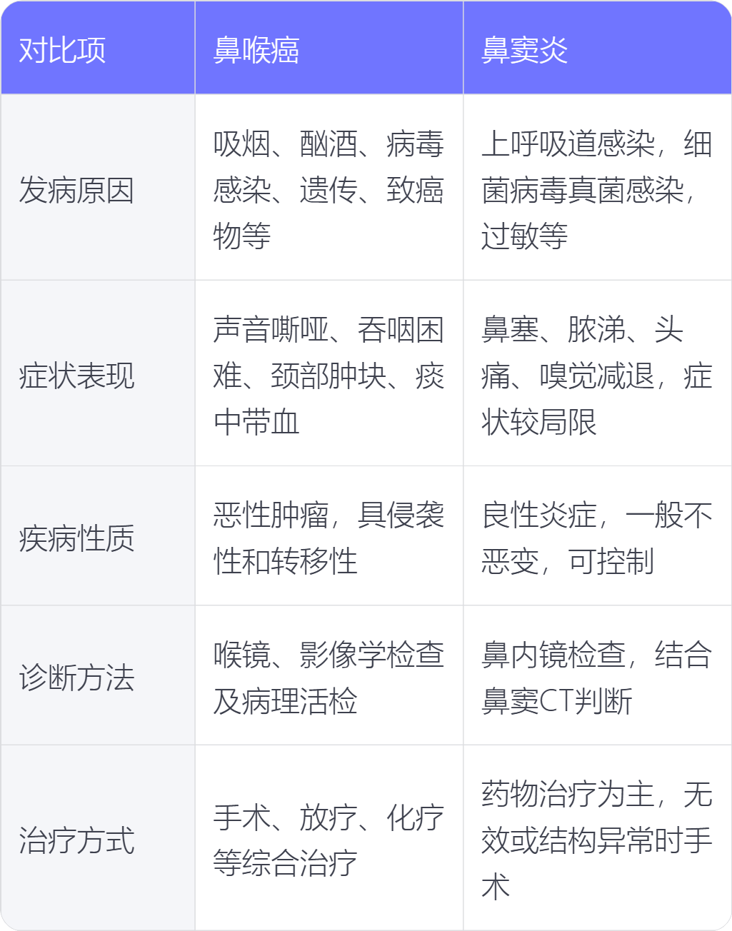 鼻喉癌和鼻窦炎在发病原因、症状表现、疾病性质、诊断方法、治疗方式上存在不同。
