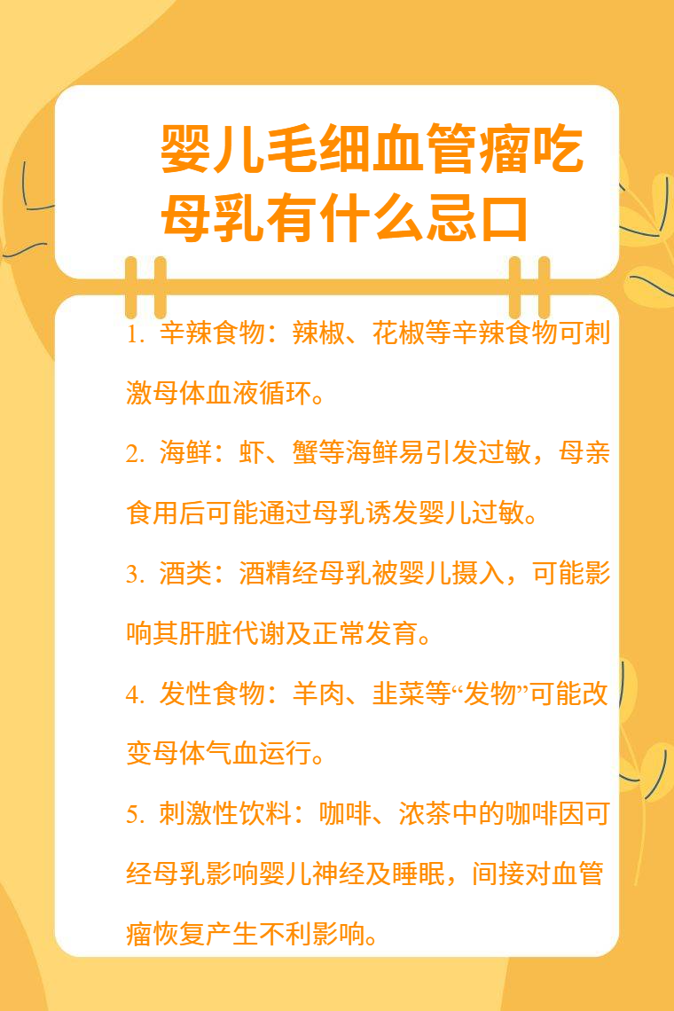 4. 发性食物:例如羊肉、狗肉、韭菜等发性食物,食用后可能会使人体的气血运行发生变化,导致体内的湿热等邪气加重。母亲食用后,这种变化可能通过母乳传递给婴儿,影响婴儿身体内环境,促使毛细血管瘤生长加快。