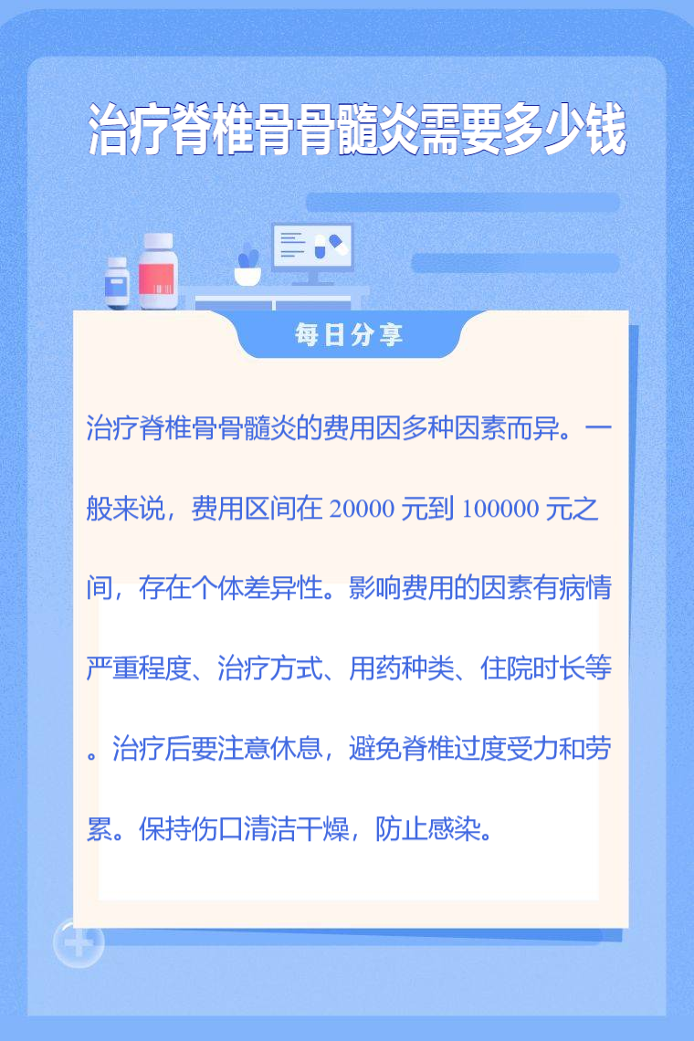 治疗脊椎骨骨髓炎的费用因多种因素而异。一般来说,费用区间在 20000 元到 100000 元之间,存在个体差异性。影响费用的因素有病情严重程度、治疗方式、用药种类、住院时长等。