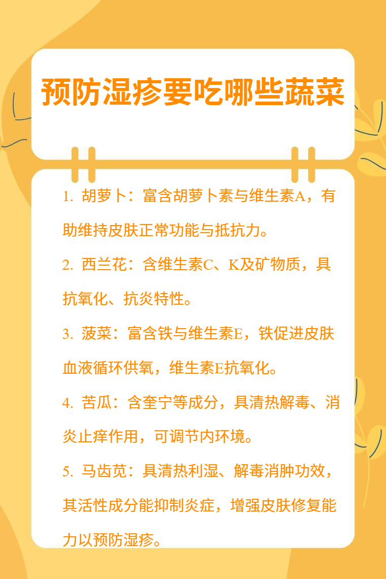 预防湿疹可食用的蔬菜有胡萝卜、西兰花、菠菜、苦瓜、马齿苋等。