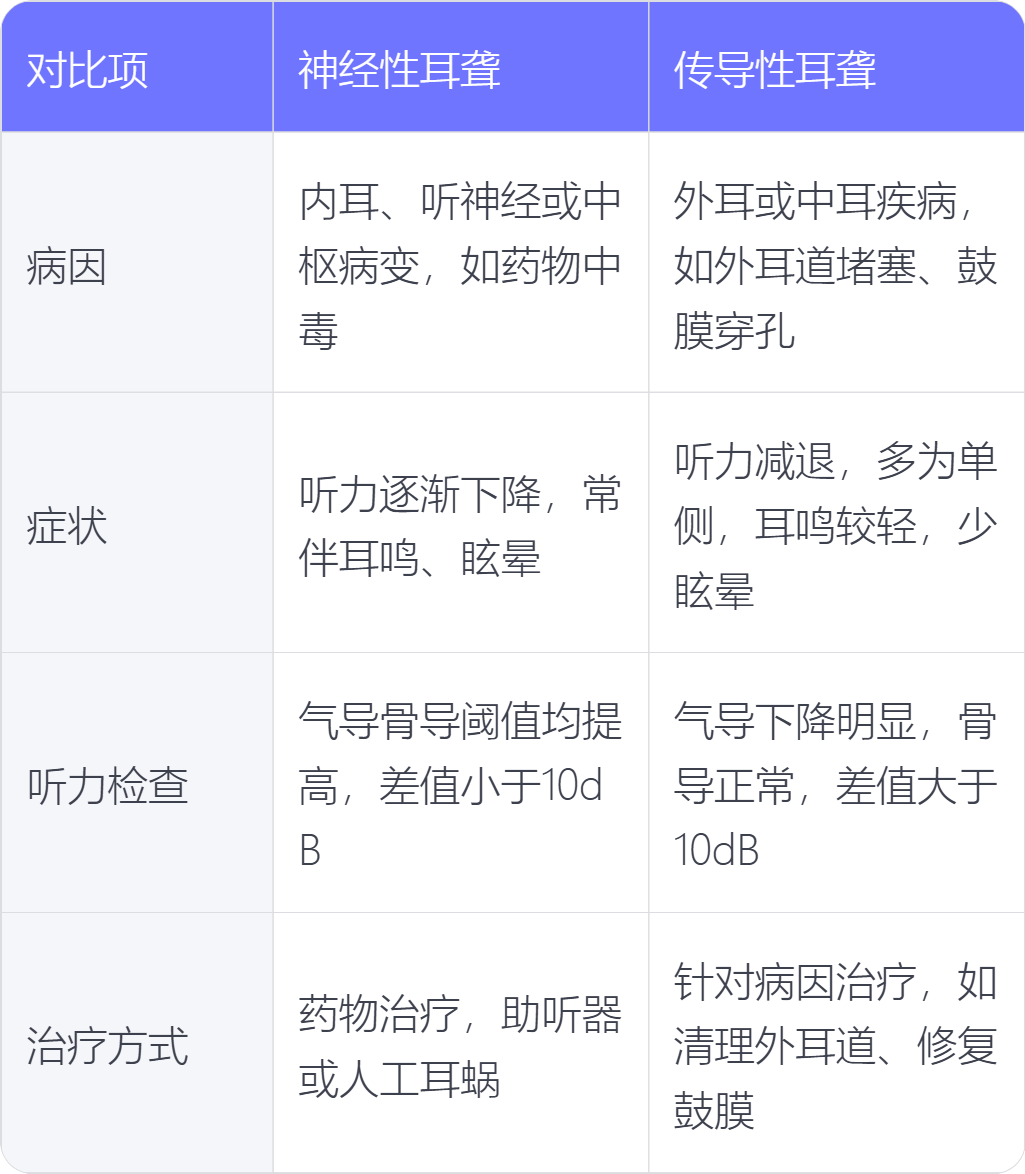 神经性耳聋和传导性耳聋可从病因、症状、听力检查、治疗方式来区分。