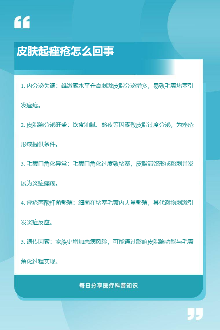 皮肤起痤疮常见原因有内分泌失调、皮脂腺分泌旺盛、毛囊口角化异常、痤疮丙酸杆菌繁殖、遗传因素等。