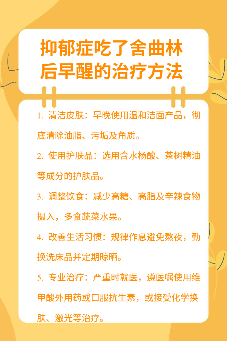 抑郁症吃了舍曲林后早醒可通过调整舍曲林剂量、联合其他药物治疗、心理治疗、生活方式调整、光照治疗等方法改善。