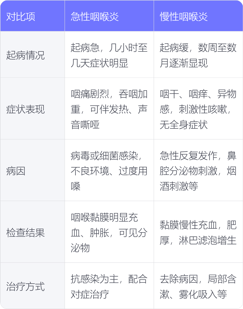 起病情况、症状表现、病因、检查结果、治疗方式是分辨咽喉炎急慢的关键要点。