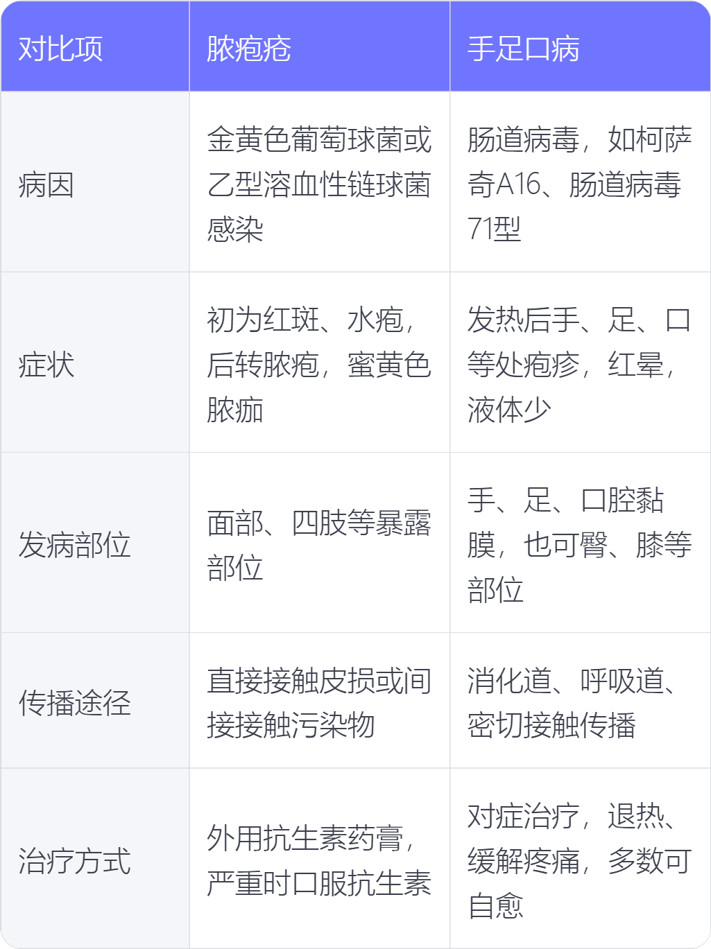 脓疱疮和手足口病在病因、症状、发病部位、传播途径、治疗方式上存在不同。
