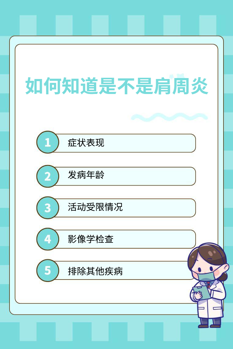 判断是否为肩周炎可从症状表现、发病年龄、活动受限情况、影像学检查、排除其他疾病等方面入手。