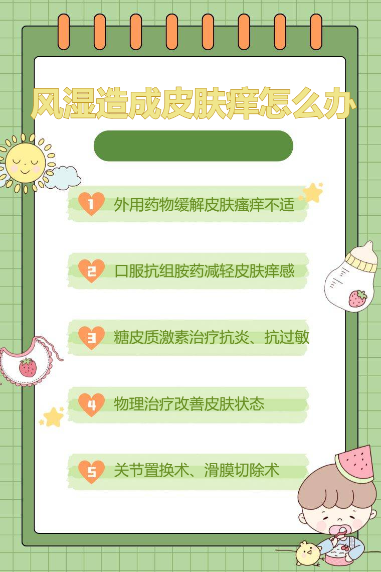 风湿造成皮肤痒可通过外用药物、口服抗组胺药、糖皮质激素治疗、物理治疗、手术治疗等方法缓解。