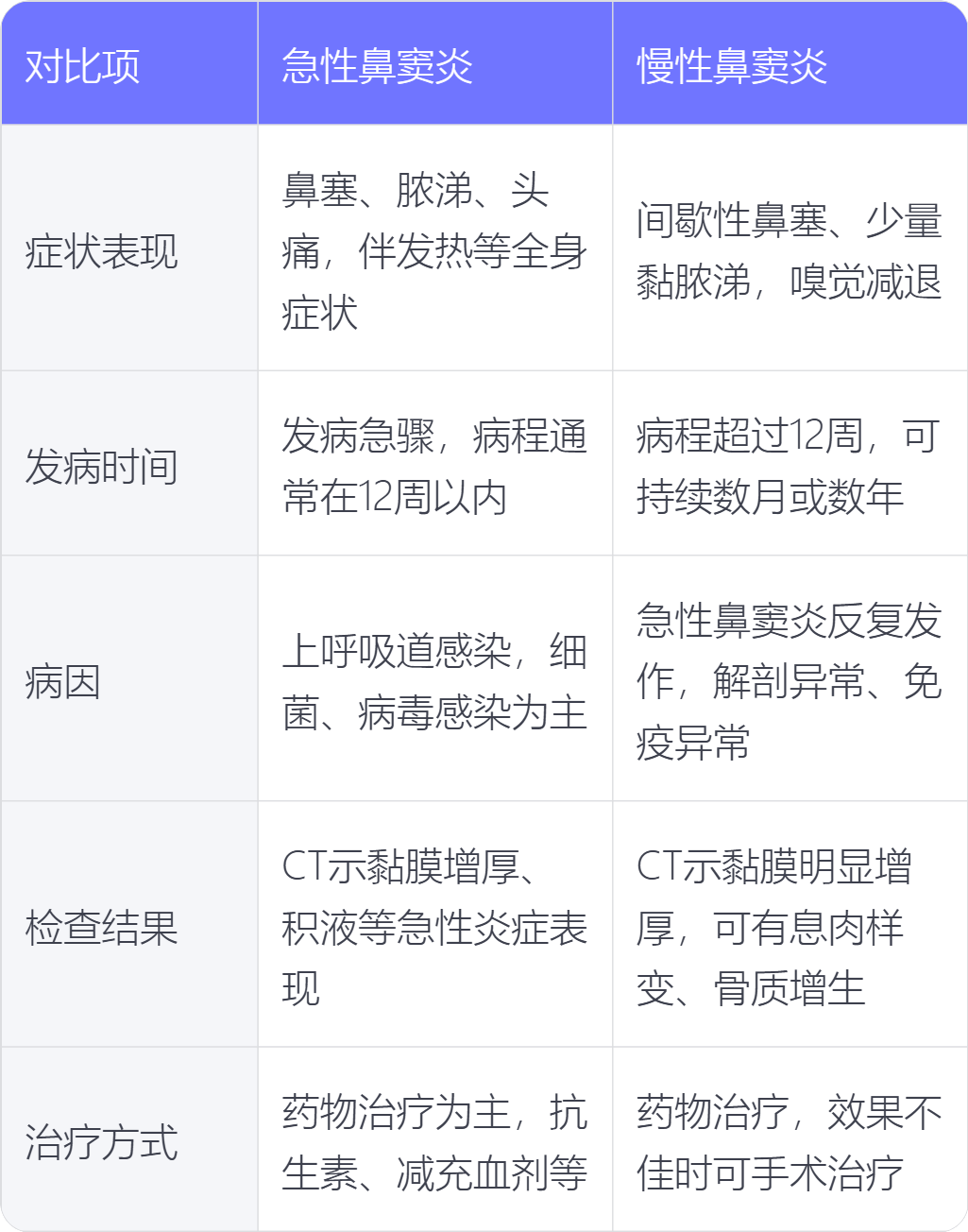 急性鼻窦炎和慢性鼻窦炎可从症状表现、发病时间、病因、检查结果、治疗方式来判断。