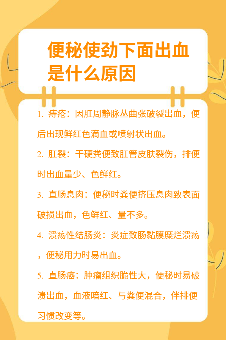 便秘使劲下面出血常见原因有痔疮、肛裂、直肠息肉、溃疡性结肠炎、直肠癌等。