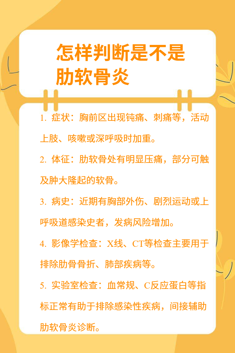 3. 病史:若近期有胸部外伤史、剧烈运动史、上呼吸道感染史等,可能增加肋软骨炎发病几率,对诊断有一定参考价值。
