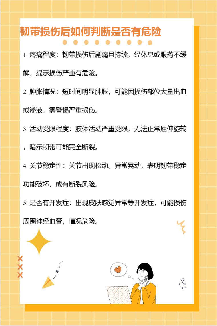 韧带损伤后需密切关注自身状况,尽量减少活动并适当休息。若出现上述危险迹象,应及时就医,遵循医生的诊断和治疗建议,积极配合治疗,以促进恢复,降低后续不良影响的发生几率 。