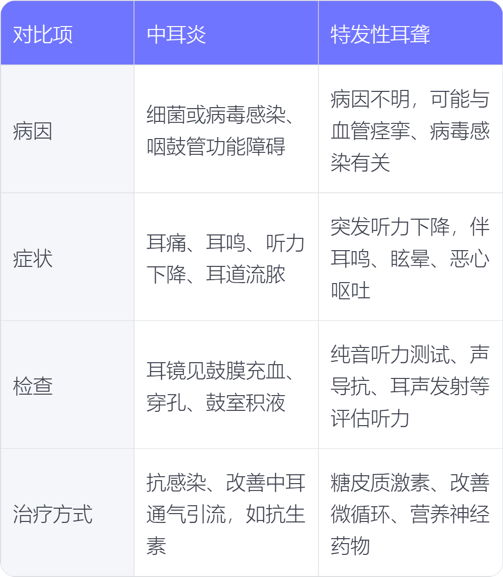中耳炎与特发性耳聋在病因、症状、检查、治疗方式上存在不同。