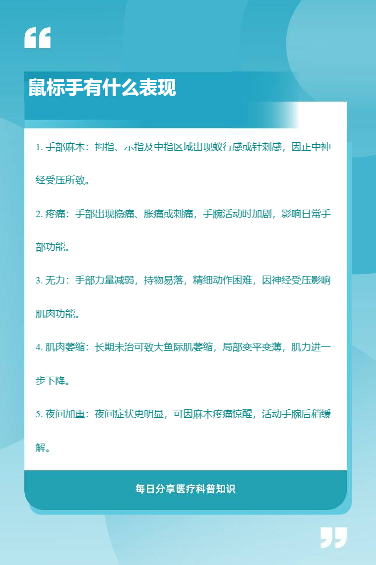 鼠标手的表现有手部麻木、疼痛、无力、肌肉萎缩、夜间加重等。