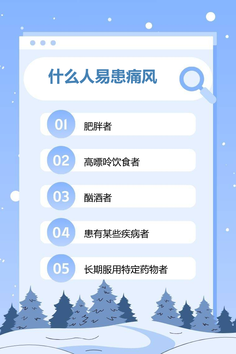 肥胖者、高嘌呤饮食者、酗酒者、患有某些疾病者、长期服用特定药物者等易患痛风。
