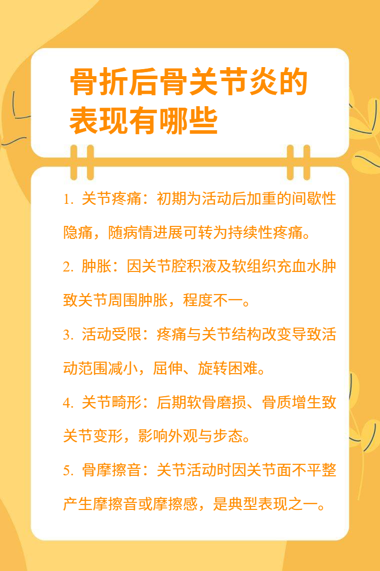 骨折后骨关节炎的表现有关节疼痛、肿胀、活动受限、关节畸形、骨摩擦音等。