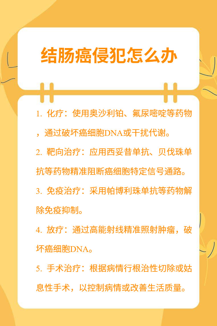 结肠癌侵犯可通过化疗、靶向治疗、免疫治疗、放疗、手术治疗等方法应对。