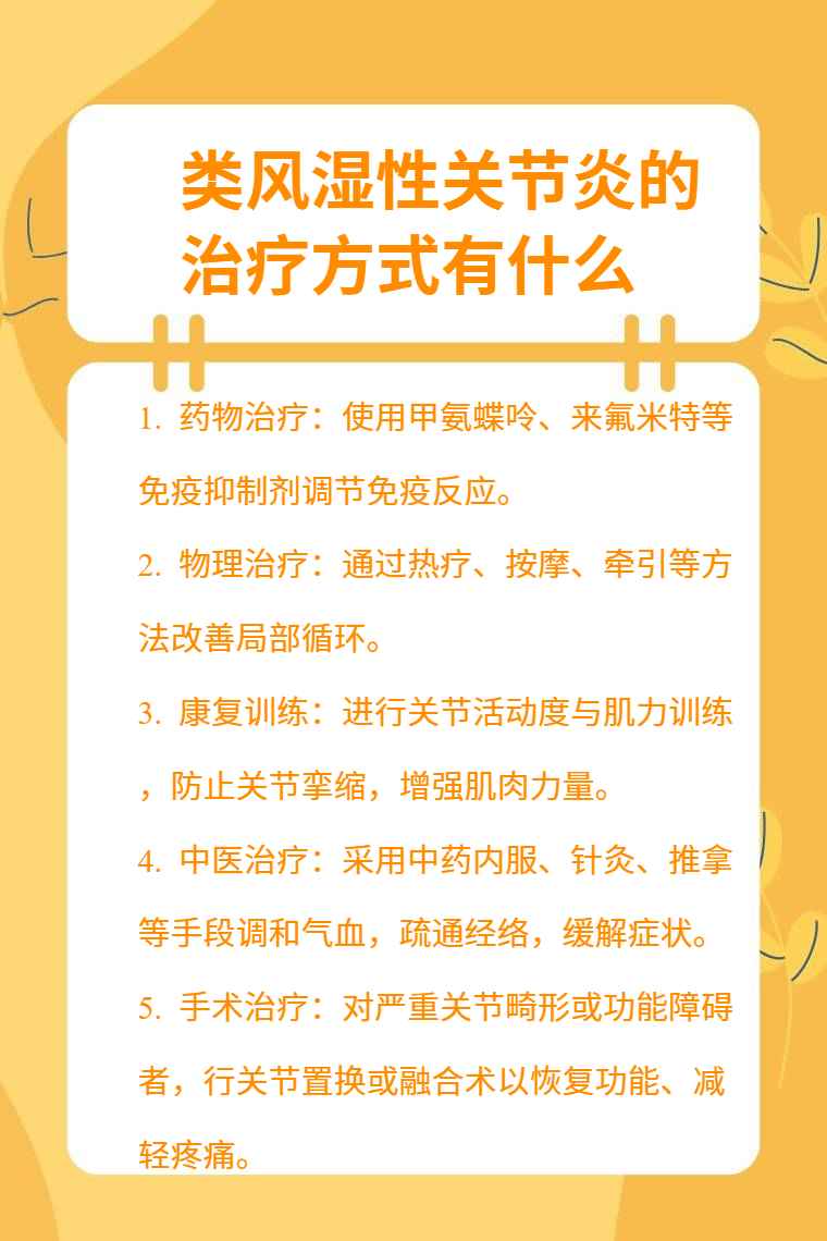 类风湿性关节炎的治疗方式有药物治疗、物理治疗、康复训练、中医治疗、手术治疗等。