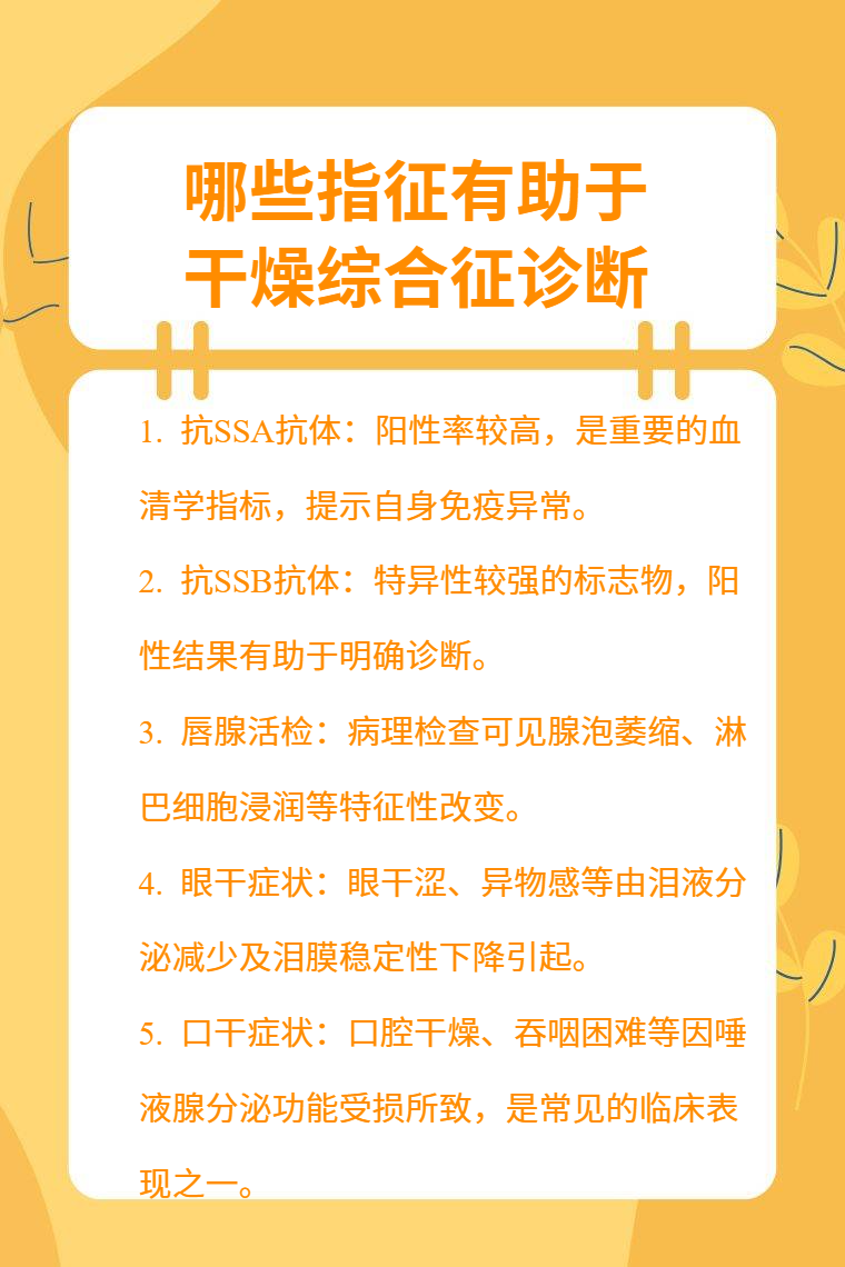 抗SSA抗体、抗SSB抗体、唇腺活检、眼干症状、口干症状等有助于干燥综合征诊断。