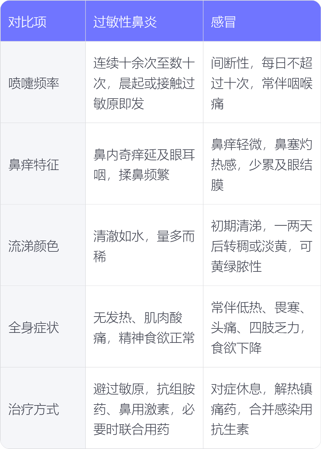 过敏性鼻炎与感冒在喷嚏频率、鼻痒特征、流涕颜色、全身症状及治疗方式五方面呈现差异。